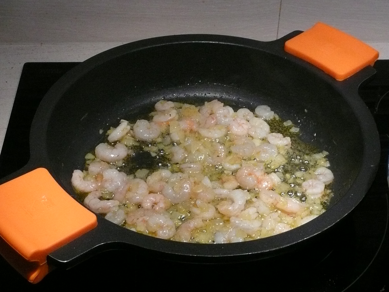 gramos de pasta. 150 gramos de gambas peladas. 1 cebolla. 2 lonchas de jamón